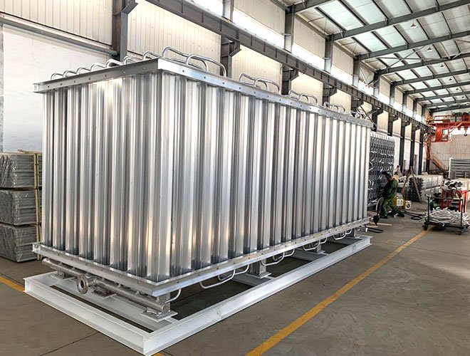 高壓空溫氣化器直接安裝在站場內(nèi)部,用以將柱塞泵升壓后的低溫液體通過吸收自然環(huán)境的熱量直接氣化成為高壓氣體,完成液體到氣體的轉(zhuǎn)變。