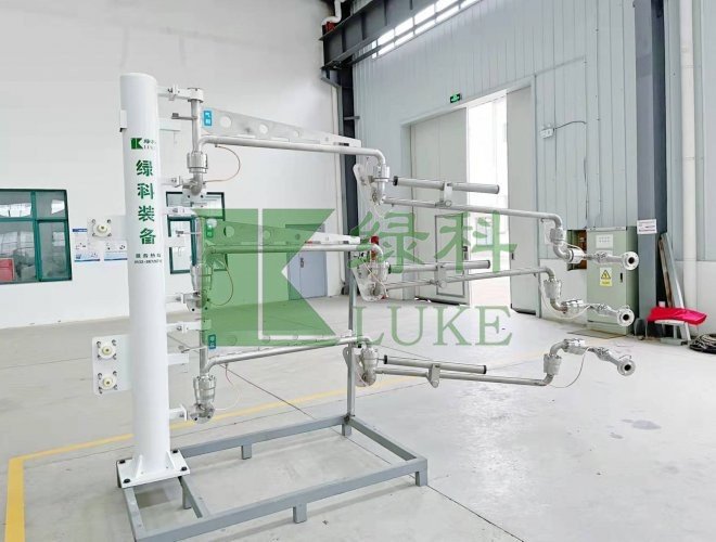 無氮氣保護(hù)裝置裝卸車臂:裝卸車臂由液相臂、氣相臂、增壓臂組成。卸車臂的轉(zhuǎn)向閥采用特殊密封,保證空氣不會進(jìn)入轉(zhuǎn)向閥的內(nèi)部,避免了出現(xiàn)轉(zhuǎn)向閥結(jié)冰無法轉(zhuǎn)動的現(xiàn)象。該裝卸車臂不用氮氣保護(hù)系統(tǒng),減少了設(shè)備投資和后期運行過程中購買氮氣消耗的費用。